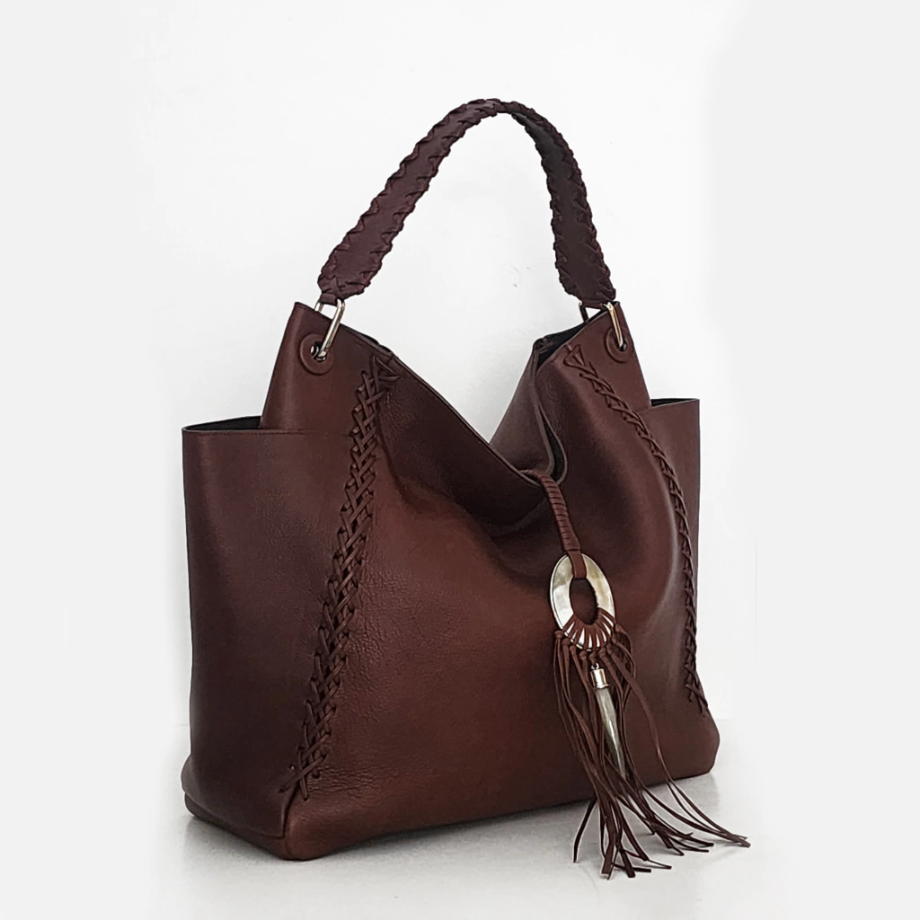 Bolso realizado en 100% cuero vacuno. Un diseño que aporta aire fresco a los modelos más emblematicos de la marca, Bond es un nuevo diseño versátil, cómodo que se distingue por tanto por su manija como detalles laterales que son cuidadosamente trenzados uno a uno, de forma minuciosa, junto a su herraje de metal combinado con asta y tiras de cuero al tono logran un modelo contemporáneo, como todos nuestros diseños, es realizado completamente a mano.