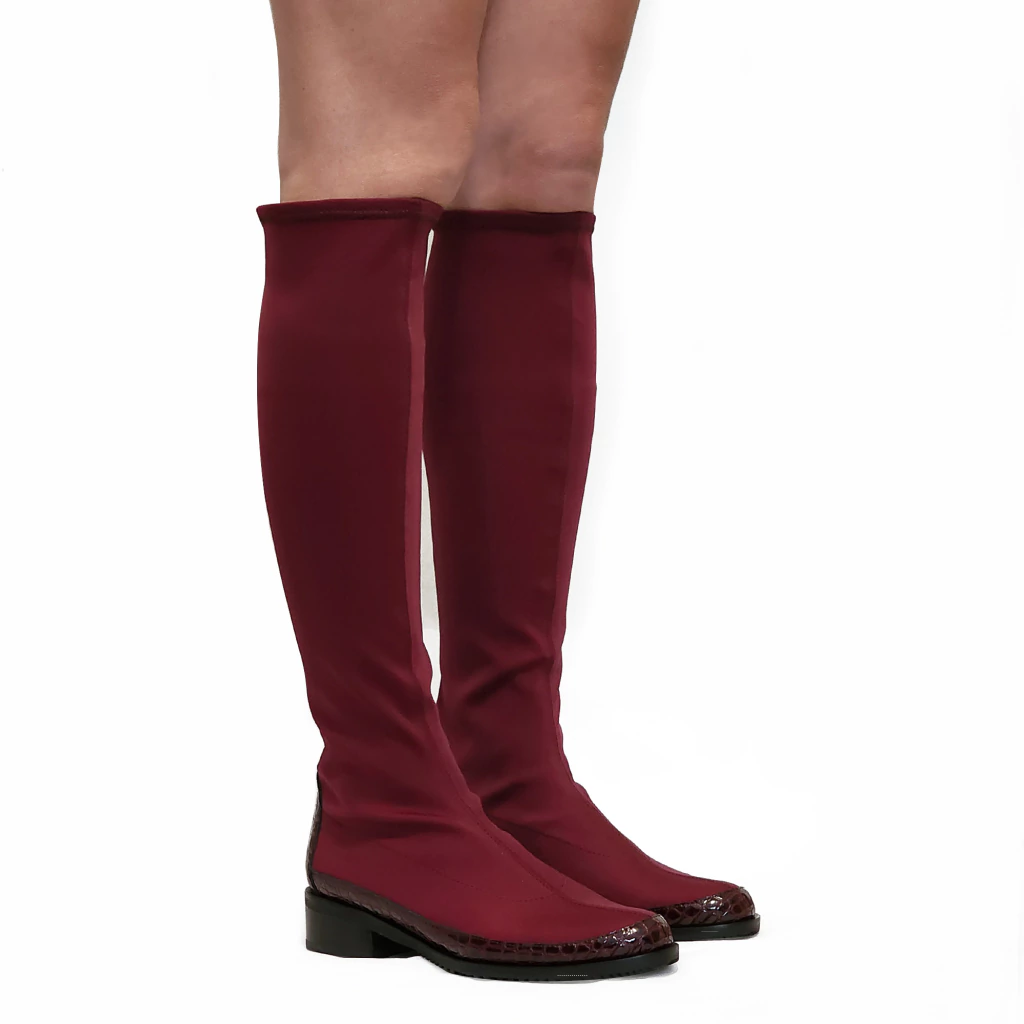 Bota en lycra con detalles en charol, de taco bajo y horma cómoda garantizando el confort en el uso.