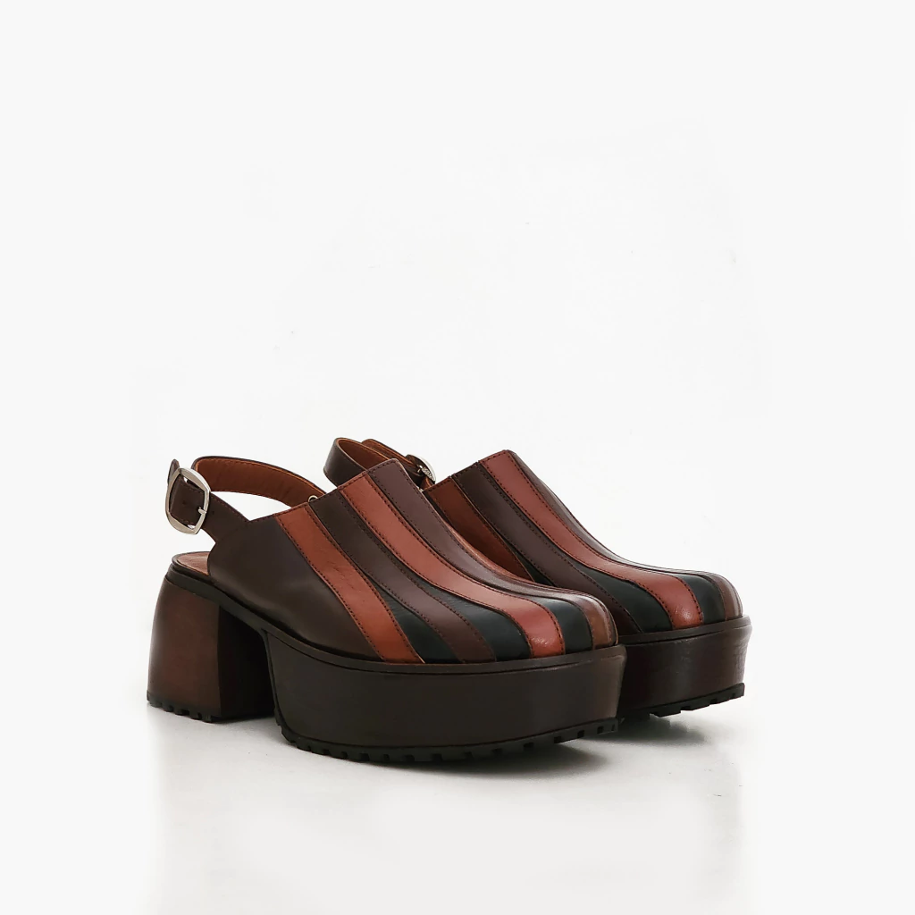 Un diseño pesando y desarrollado para ser ligero, es la expresión de lo artesanal, de un estilo atemporal y único. Reimagina la dualidad de la marca con un toque modernista. Este diseño, hecho en cuero, con plataforma de madera forrada en cuero, aporta un look original y contemporáneo, Una reinterpretación de modelos desarrollados durante los inicios de Santesteban. un modelo retro pero de una forma totalmente nueva.